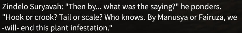 ✧ "She's crashed damn near every airship she's been on. She's stolen almost as many. Rumor is it's almost too easy for her to get her hands on them things."✧ "Check the bounty boards, she's got a pretty sum of gil waiting in exchange for her head in a couple smaller towns. Only Fairuza knows why, and she ain't tellin' anyone the truth."✧ "Her mentor wasn't on the right side of the law either, so Fairuza used stolen heirlooms to practice her goldsmithing with and the owners are still pissed. Very pissed."